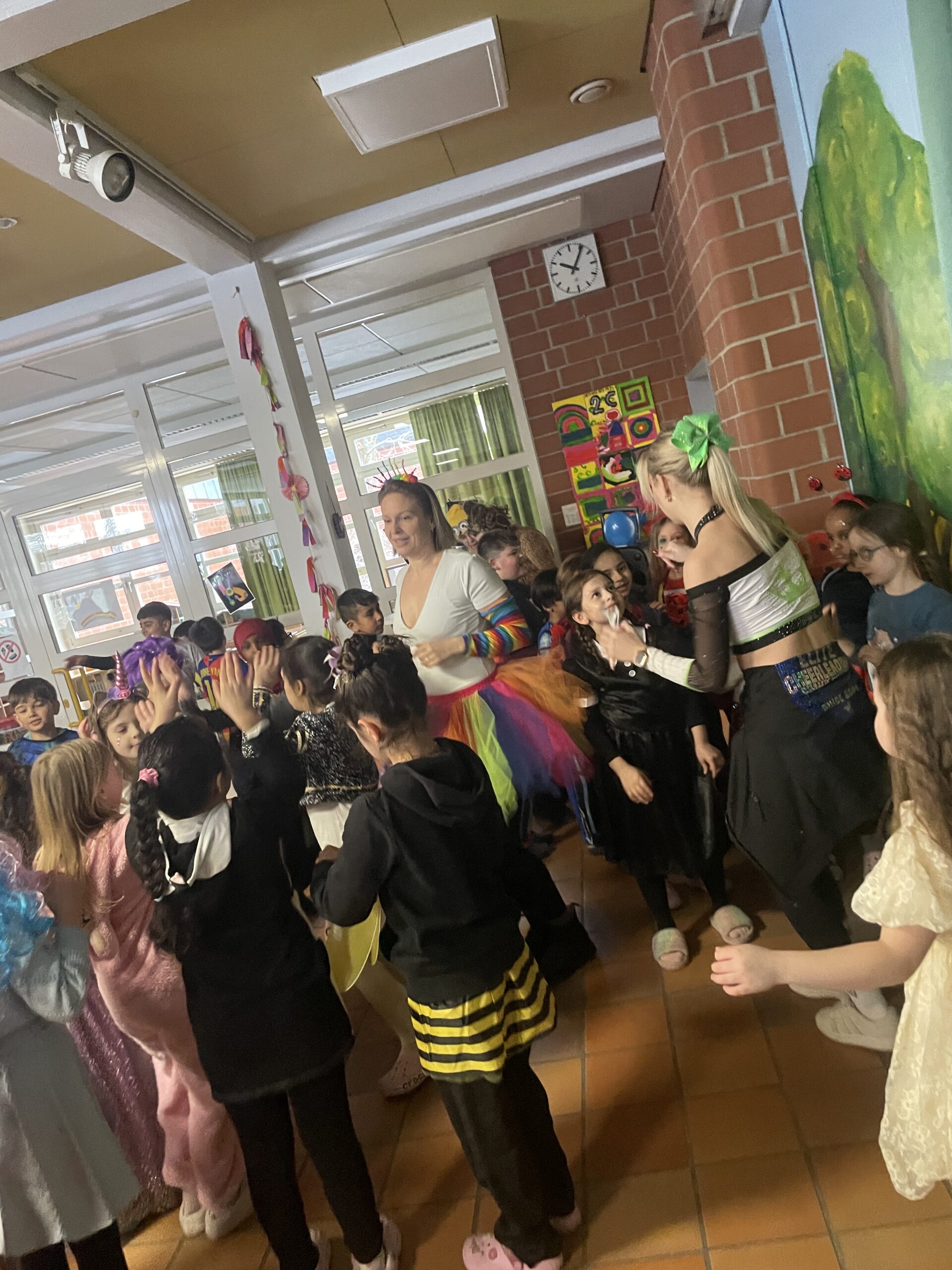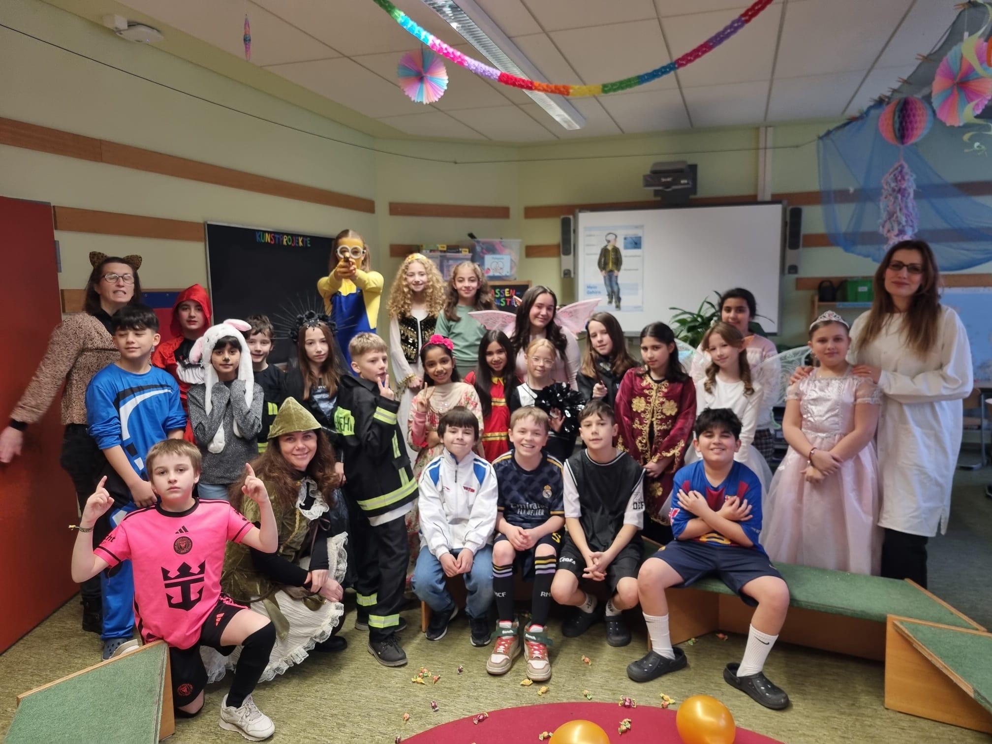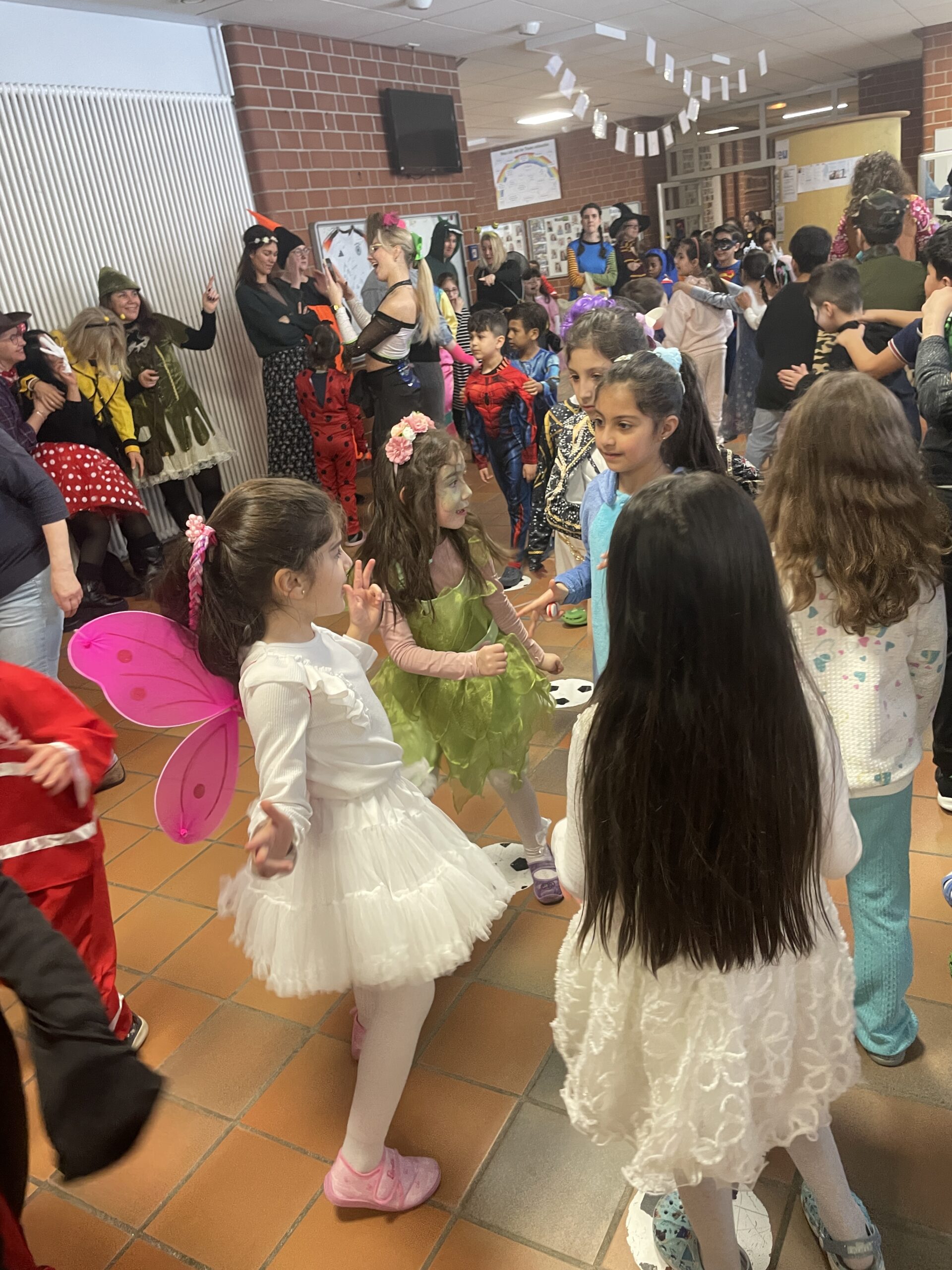 Jubel, Trubel und Heiterkeit war am Rosenmontag das Motto in der Regenbogenschule. Kleine Prinzessinnen, Hexen, Batmans, Polizisten, Schmetterlinge, Blumenmädchen, Indianer oder Cowboys feierten fröhlich Fasching. Auch die Lehrkräfte, die Inklusionsassistenzen und Ganztagsmitarbeiter erkannte man nicht, denn auch alle Erwachsenen waren verkleidet in die Schule gekommen.