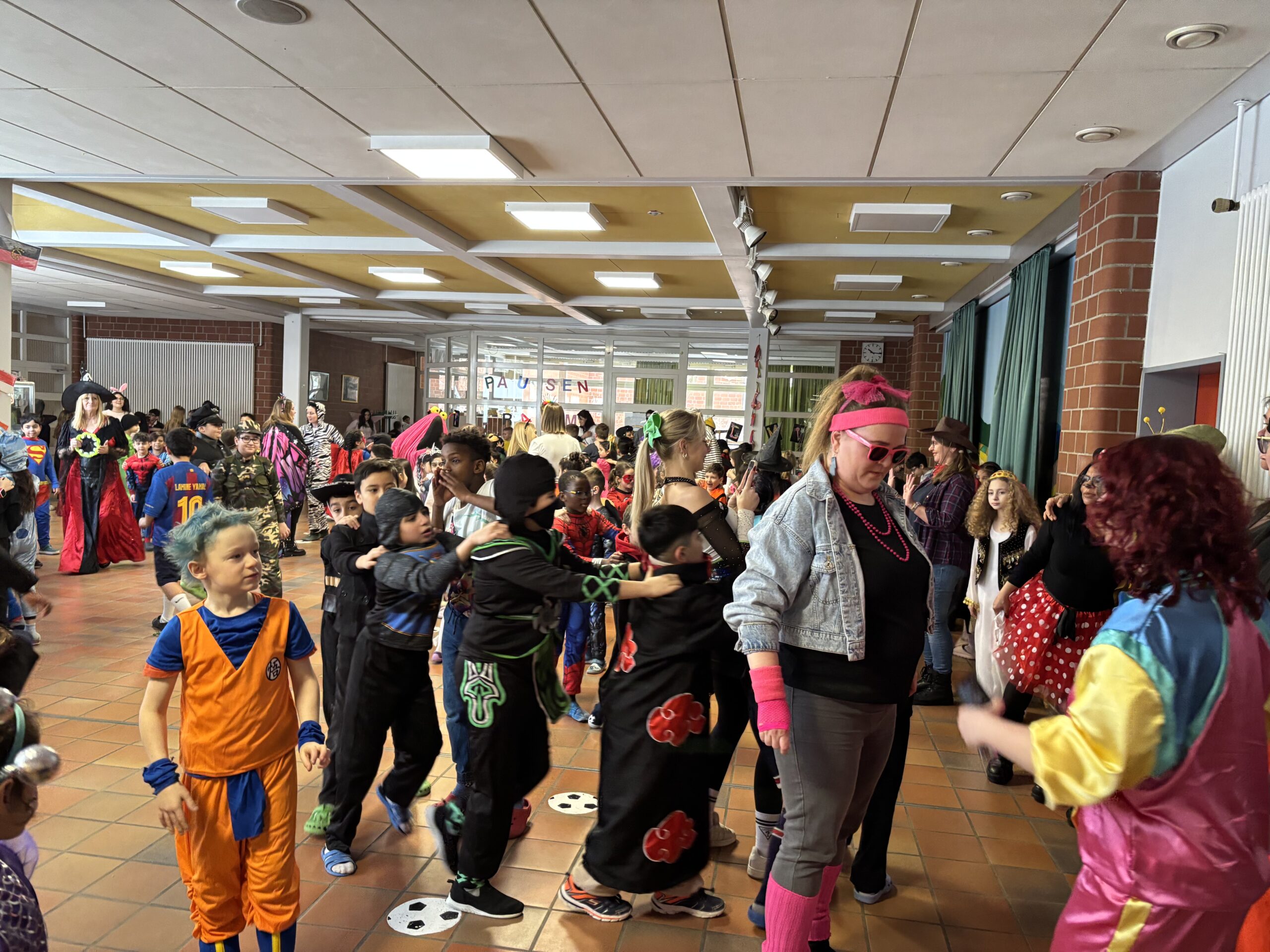 Bei der großen Polonaise um 10.00 Uhr schlängelten sich alle Klassen durch die Pausenhalle und tanzten gemeinsam zu Partyhits.